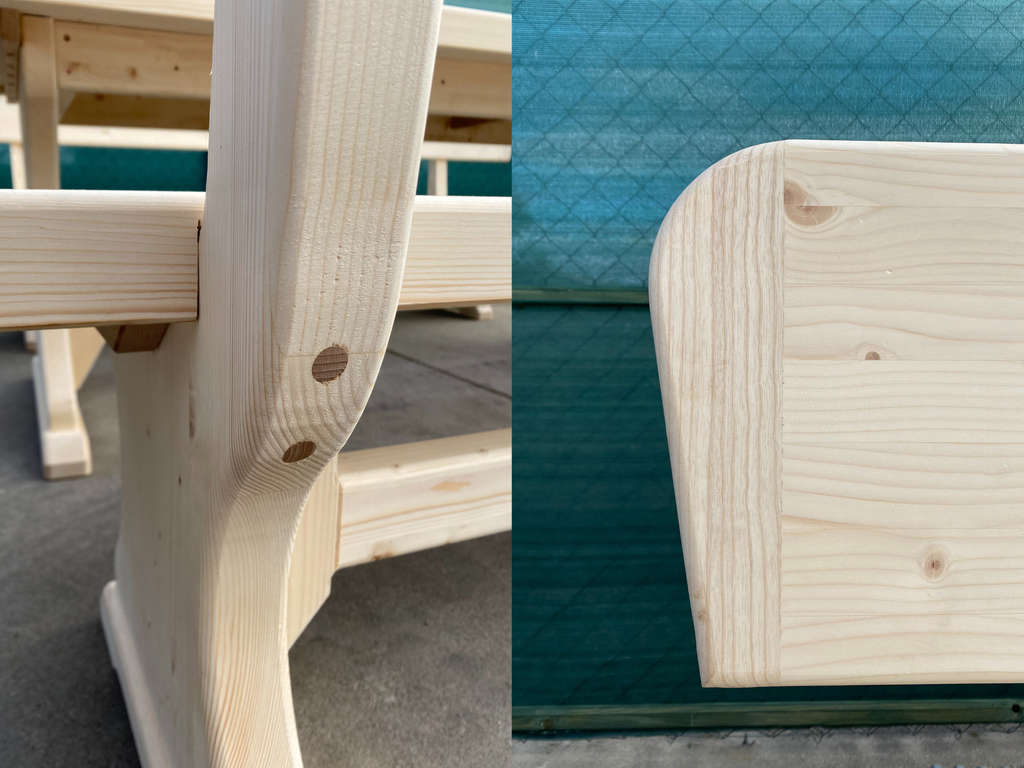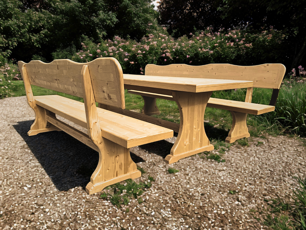 Diese massive Sitzgarnitur aus kammergetrockneter nordischer Fichte vereint rustikalen Charme mit handwerklicher Präzision. Durch die natürliche Maserung des Holzes erhält jedes Set seinen ganz eigenen Charakter – kein Stück gleicht dem anderen. Für besonders beanspruchte Elemente, wie Kanten oder Lehnen, wird teils hochwertige Esche verwendet – das sorgt für zusätzliche Stabilität und optische Akzente.
