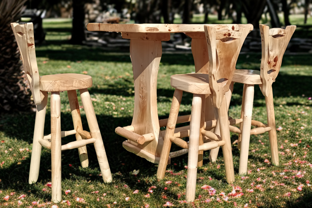 Alle Barmöbel werden in liebevoller und aufwändiger Handarbeit in Schreinerqualität gefertigt. Jedes Möbelstück ist ein Unikat, jedes verbaute Holzstück ist Massiv, ca. 6 cm stark und aufgrund der Aststruktur und Maserung einzigartig.