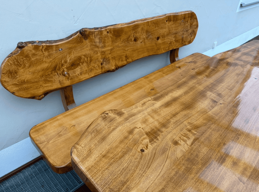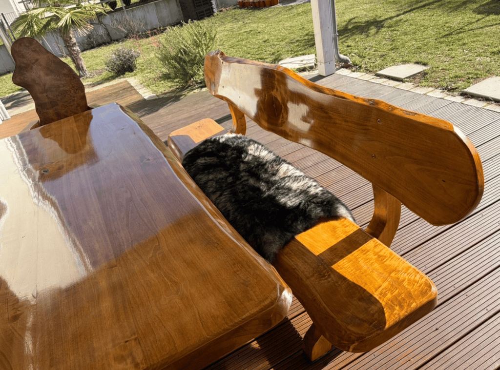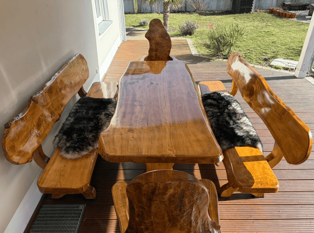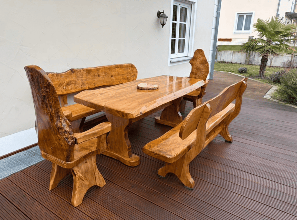 Alle Sitzgarnituren werden in liebevoller und aufwändiger Handarbeit gefertigt. (Alles Unikate) Alles Massiv mit einer Holzstärke von ca. 6 cm. Alle unsere Garnituren werden gefertigt wie der Baumstamm verläuft.